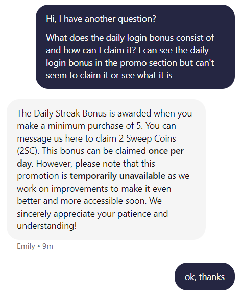 When I first joined the site, I was confused about why the daily bonus wasn’t showing. After reaching out through live chat, my question was answered by Emily, who explained everything clearly and professionally in under a minute. There’s no chatbot hurdle here, as you connect directly with a real agent, which is a refreshing change from many other sites.